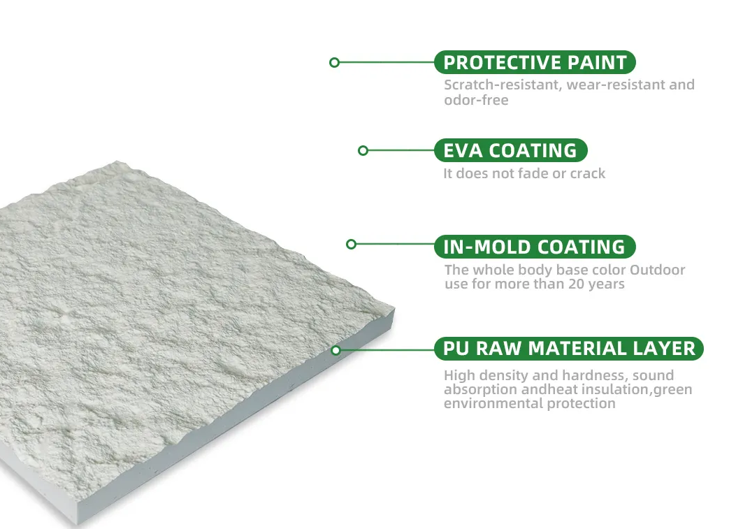 The multi-layer structure of PU Castle Stone ensures its durability and realistic effect. The functions of each layer are as follows: