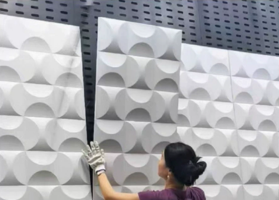 After completion, the wall presented a uniform semi-circular matrix, and the light and shadow changed with the viewing angle, becoming a popular check-in spot of the company. First-time visiting customers often mistook it for marble carving or solid wood milling. The total material cost of the project was only 1/5 of the solid wood carving scheme, and the construction time was reduced by 80%. It has been used for one year so far, with no degumming or dust accumulation on the surface, and easy cleaning. This case has been included in the "2025 China Indoor Decoration New Materials Application Yearbook".