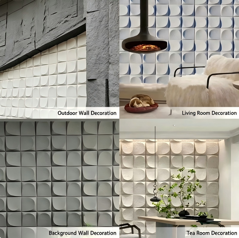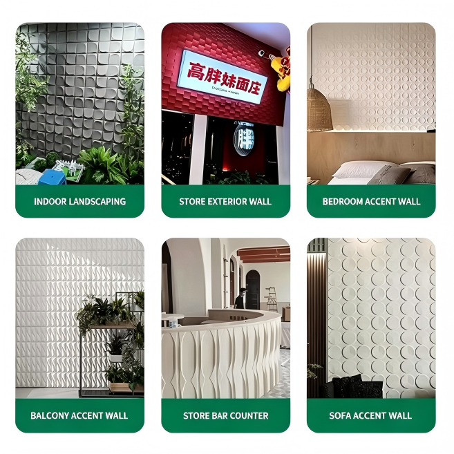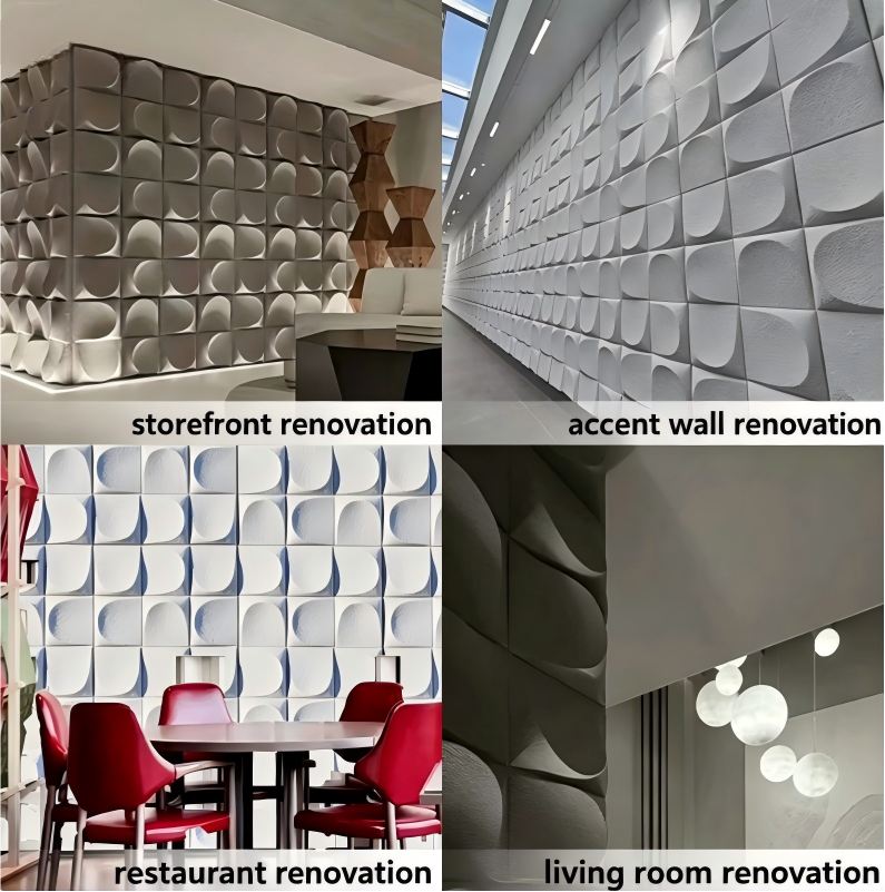 The product is suitable for indoor environments such as living room accent walls, bedroom headboards, corridor end views, and commercial spaces (hotel lobbies, cafes, exhibition halls). Compared with gypsum 3D wall panels, PU material has the advantages of light weight, non-fragility, moisture resistance, and washability.